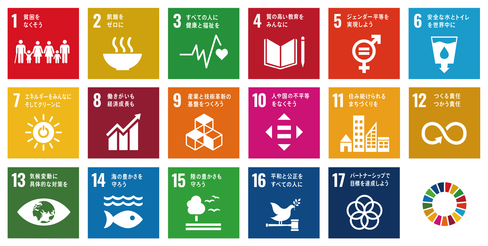 持続可能な開発目標(SDGs)とは、2001年に策定されたミレニアム開発目標(MDGs)の後継として、2015年9月の国連サミットで採択された「持続可能な開発のための2030アジェンダ」にて記載された2016年から2030年までの国際目標です。持続可能な世界を実現するための17のゴール・169のターゲットから構成され、地球上の誰一人として取り残さない(leave no one behind)ことを誓っており、これらの目標を達成するために、企業の参画・貢献も期待されています。